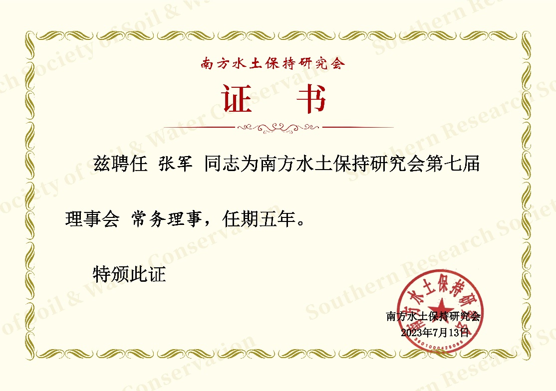 “中国南方水土保持研究会第七次会员代表大会暨2023年学术年会”于2023年7月12-15日在江西省景德镇市举办。省重点实验室派张军老师前往参会,喜获常务理事单位,持续扩大了在水土保持领域的学术影响力。同时,张军老师被选为南方水土保持研究会第七届常务理事会“常务理事”。