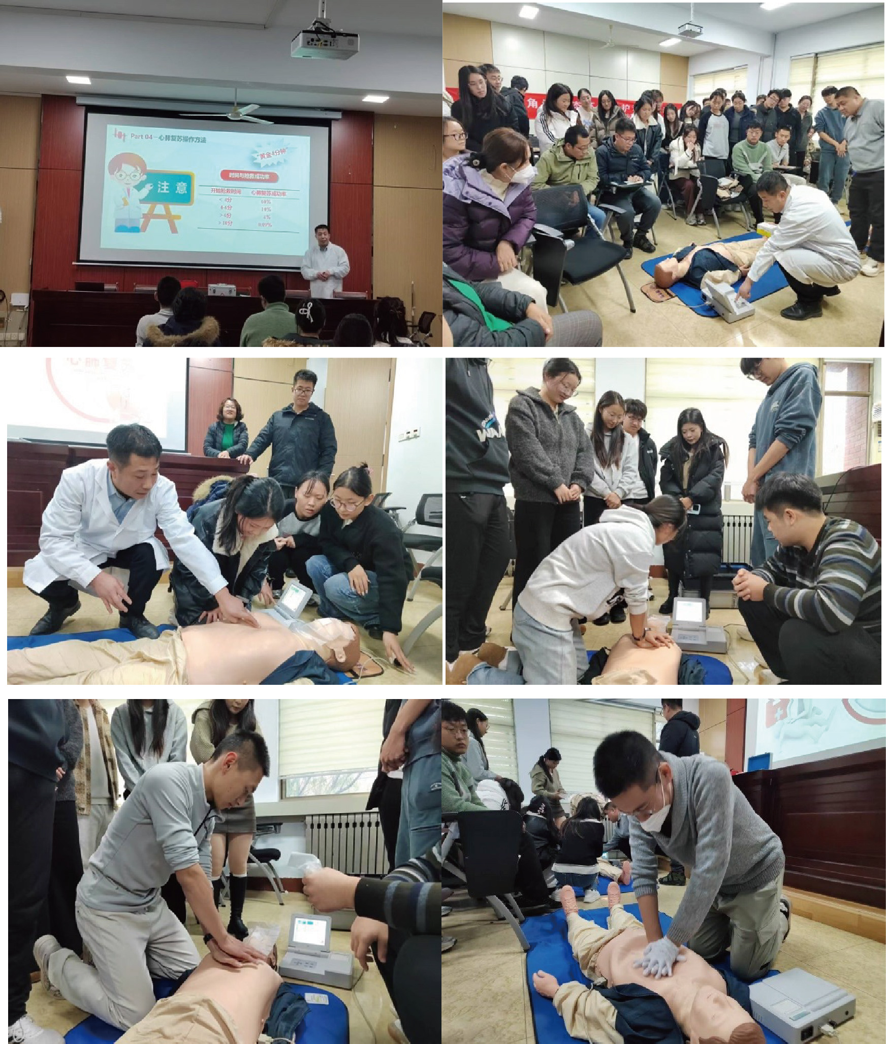 心肺复苏实操培训环节,安全工程专业申建军副教授聚焦“黄金4分钟”急救原则,通过理论讲解与实操演示相结合的方式,详细讲解心肺复苏的操作流程、动作要领及注意事项。从意识判断、呼救求助,到胸外按压的深度与频率、人工呼吸的规范操作,申老师逐一拆解示范,手把手指导参训师生进行实操演练。大家模拟急救场景,反复练习按压、通气等关键动作,切实掌握心肺复苏的核心技能,提升应对突发心脏骤停等紧急情况的处置能力。