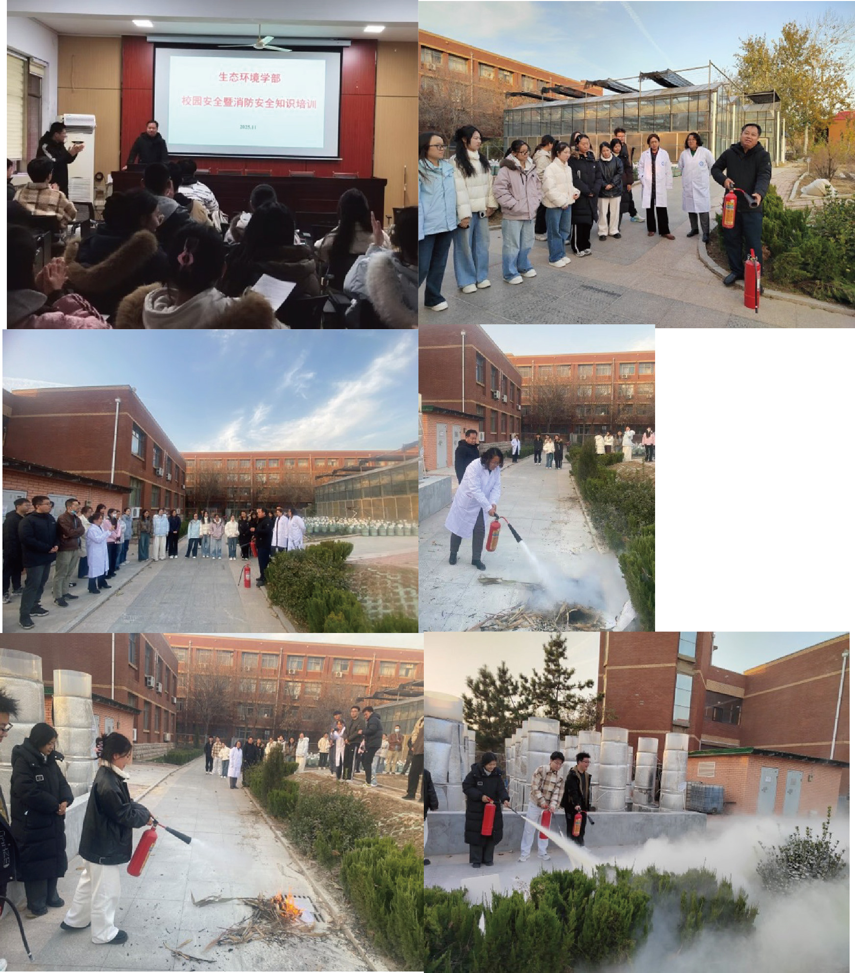 灭火器使用培训现场,保卫处消防科杨玉杰科长结合实验室常见火灾类型,详细介绍干粉灭火器/二氧化碳灭火器的适用范围、操作步骤及维护常识,演示“提、拔、握、压”四字操作法的标准动作。参训师生逐一上手实操,规范完成灭火器的开启、喷射等动作,熟悉火灾初期的扑救技巧。同时,培训还强调了实验室火灾的预防要点及逃生路线规划,引导师生牢记“先报警、后扑救、再逃生”的原则,提升火灾应急处置的实战能力。